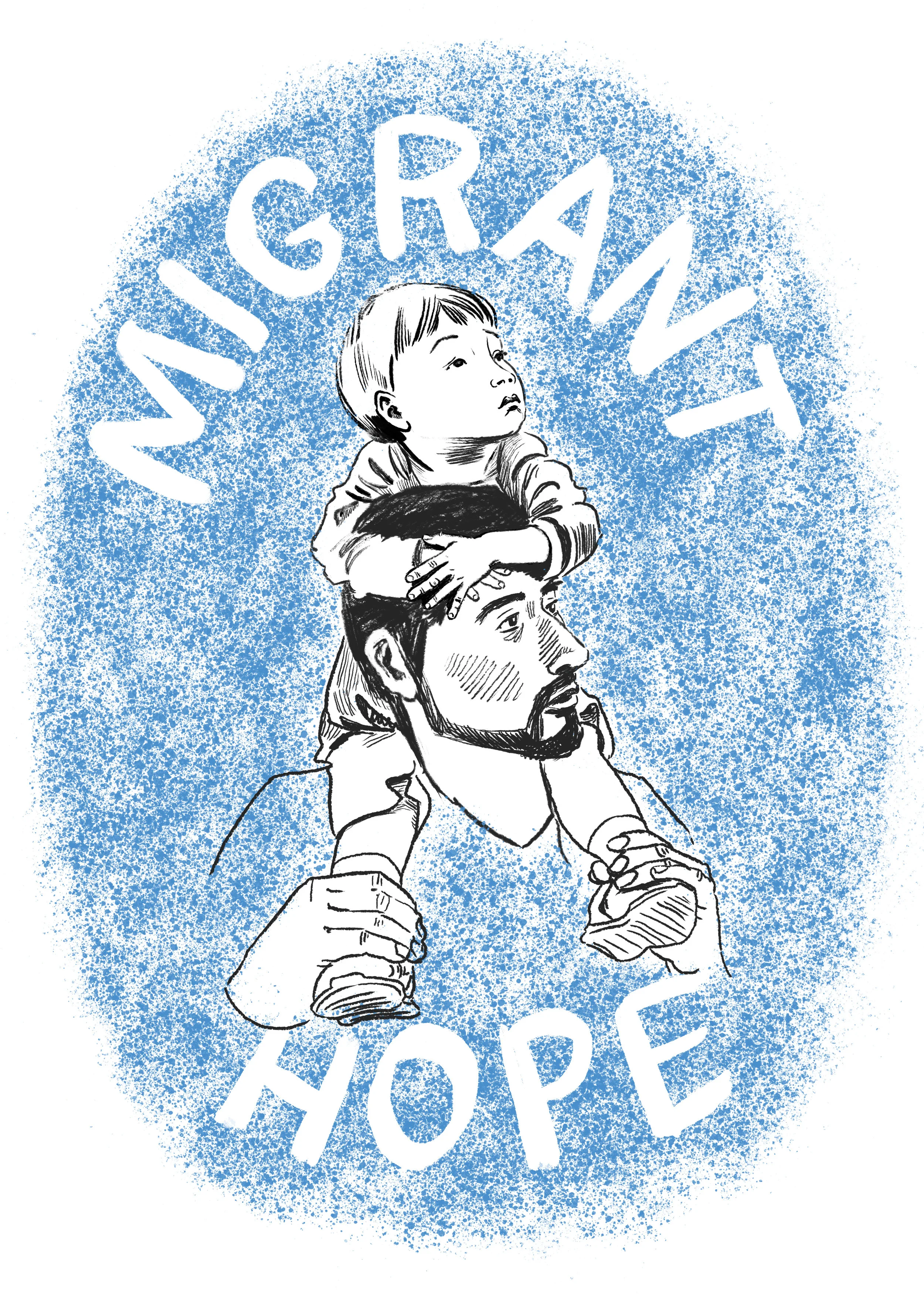 This digital illustration is an attempt to respond to the border crisis, specifically to reflect on who are the most vulnerable, who will fight for a better life for their family, and why people face unspeakable conditions to migrate. It can be found as a free digital download at https://justseeds.org/graphics/